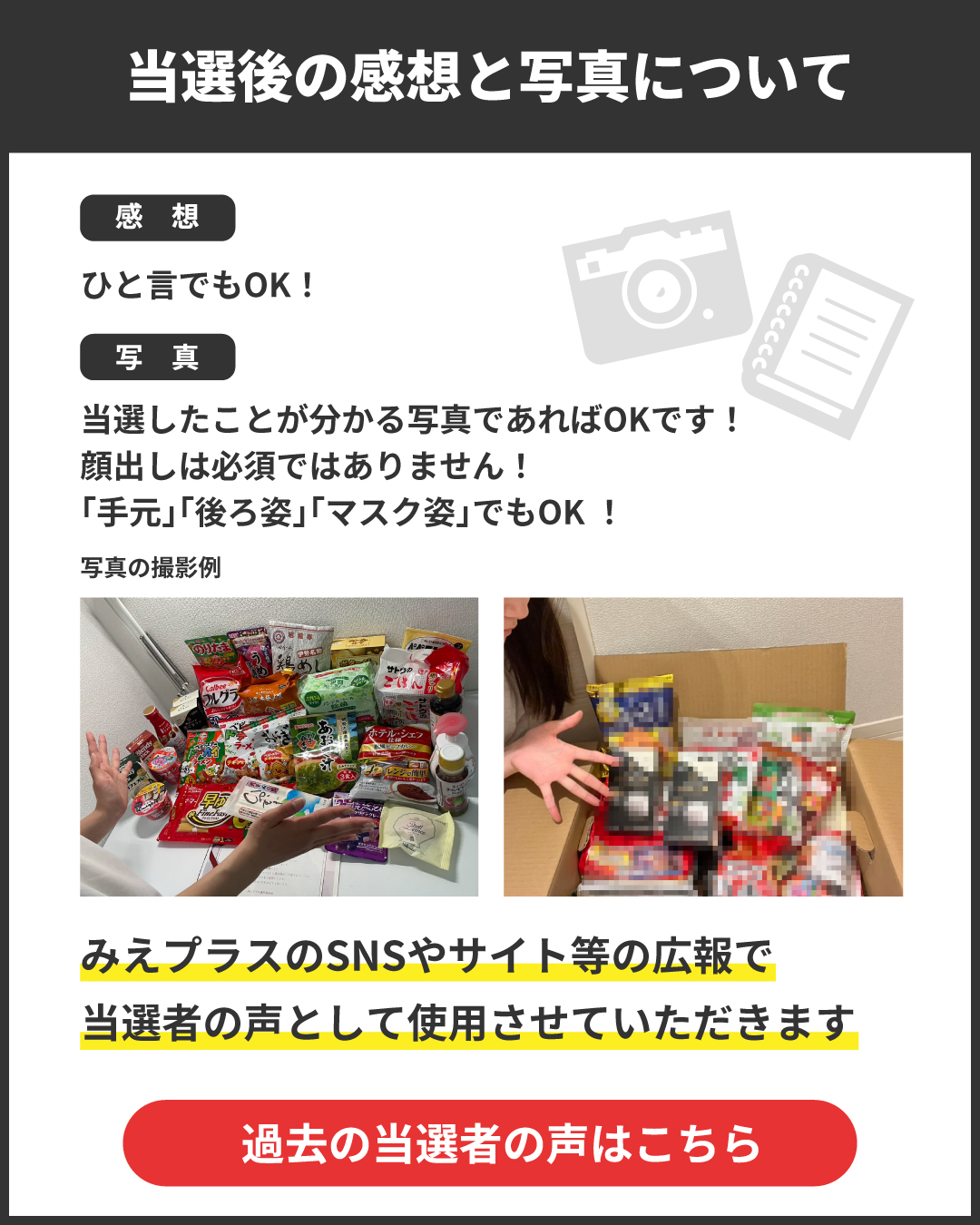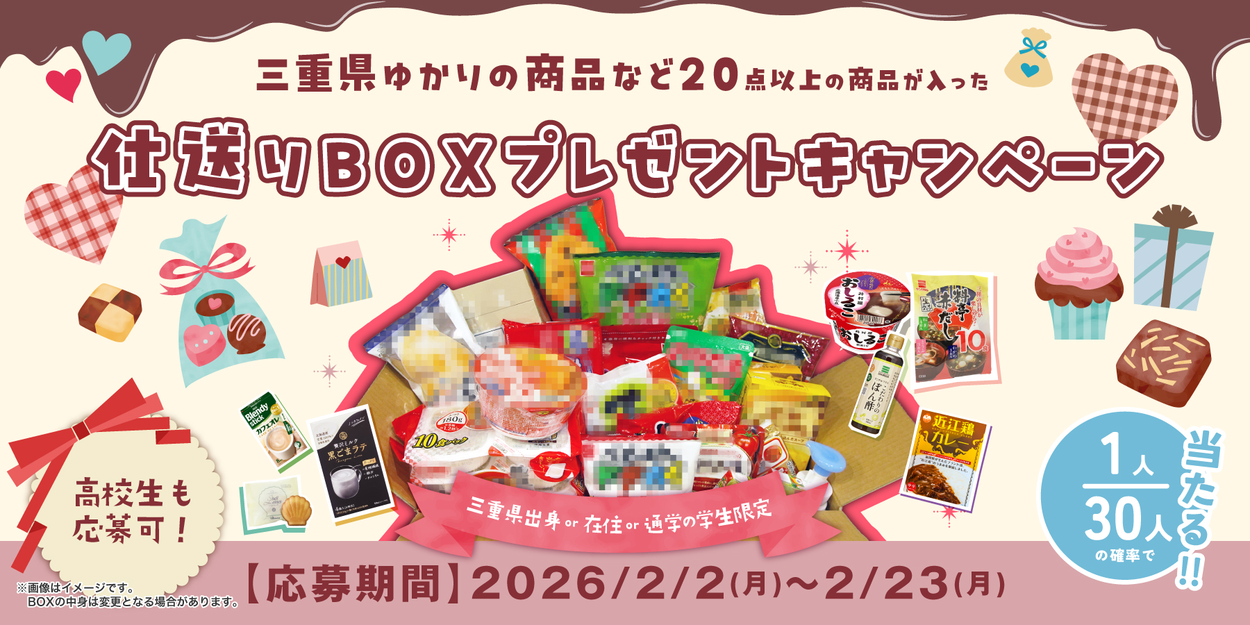 三重県企業400社以上(2026年2月時点)が集まって学生を応援するプロジェクト『みえプラス』では、頑張る学生の皆さんに食料や日用品を詰めた仕送りBOXをプレゼント!