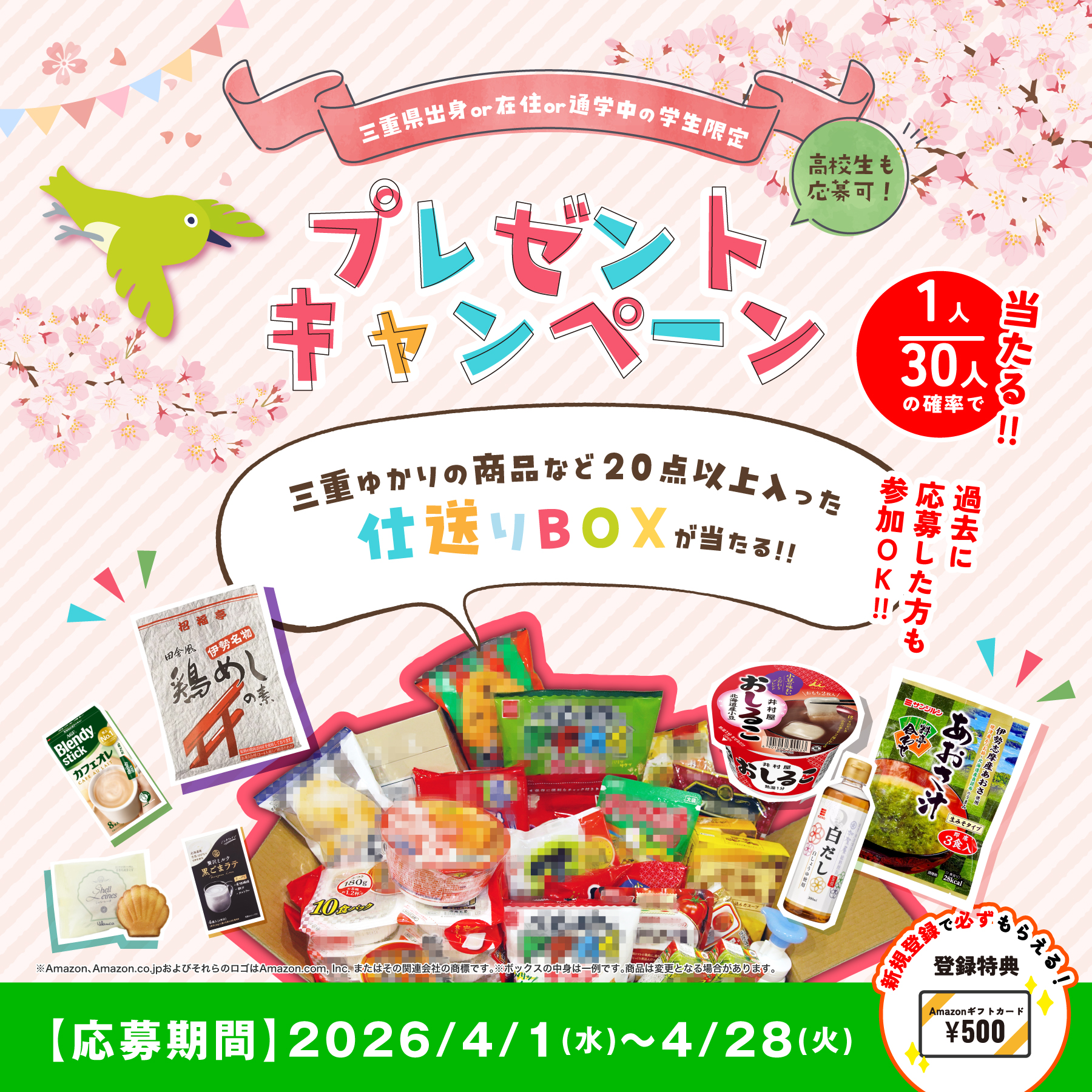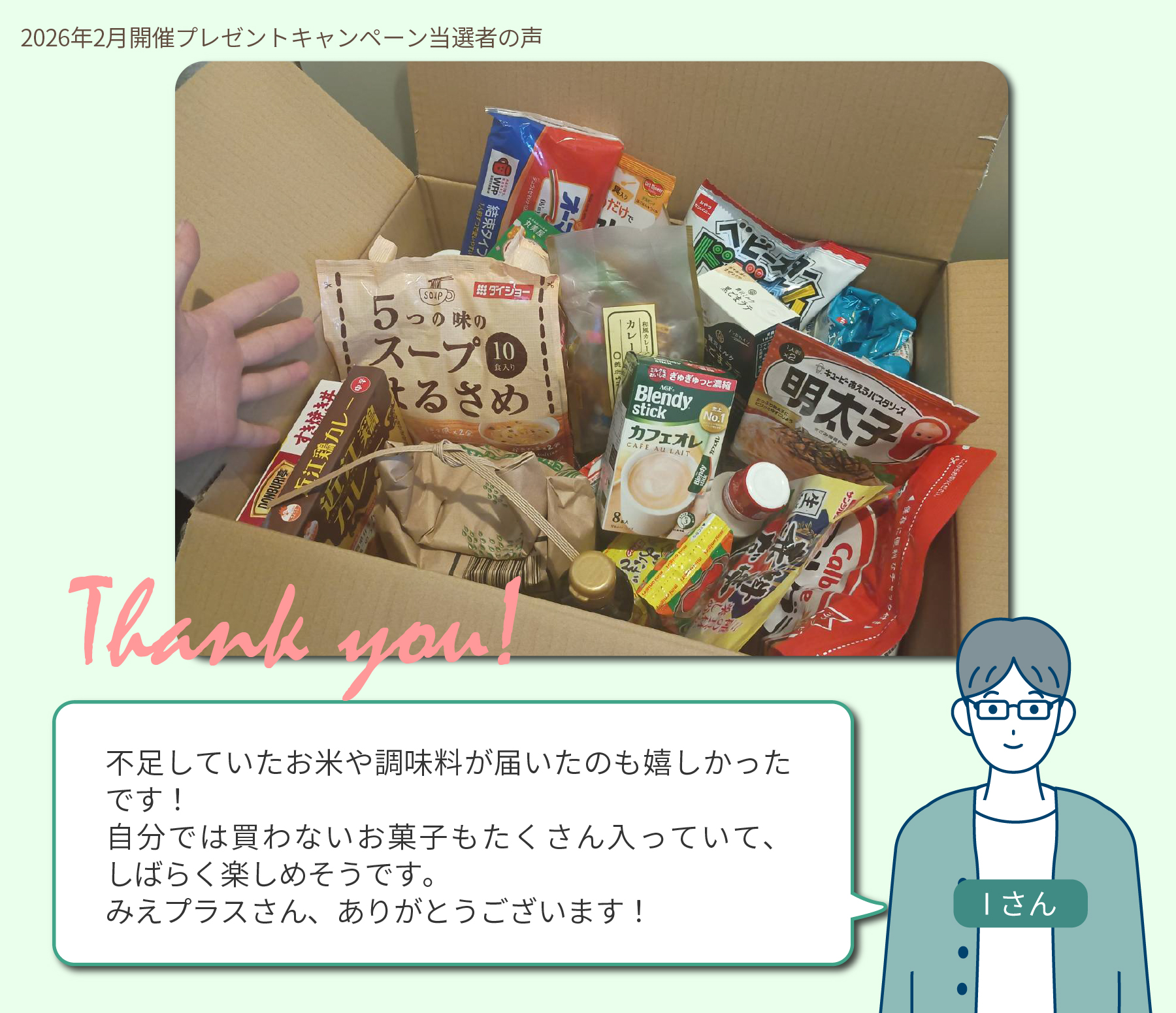 三重県企業400社以上(2026年4月時点)が集まって学生を応援するプロジェクト『みえプラス』では、頑張る学生の皆さんに食料や日用品を詰めた仕送りBOXをプレゼント!